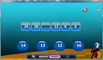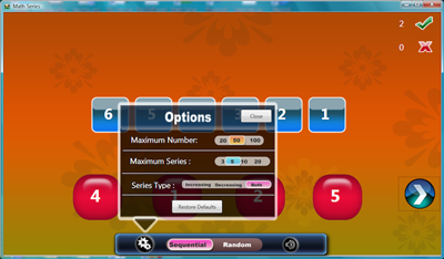 - Parents can customize this application to their kids level of expertise. The default setup is to start the kids with simple number series (1's) and after 25 problems (first award), it will advance to next series and so on. If you choose random the series will be randomly selected. Additional options to setup the maximum start number and ascending or descending options are also provided.